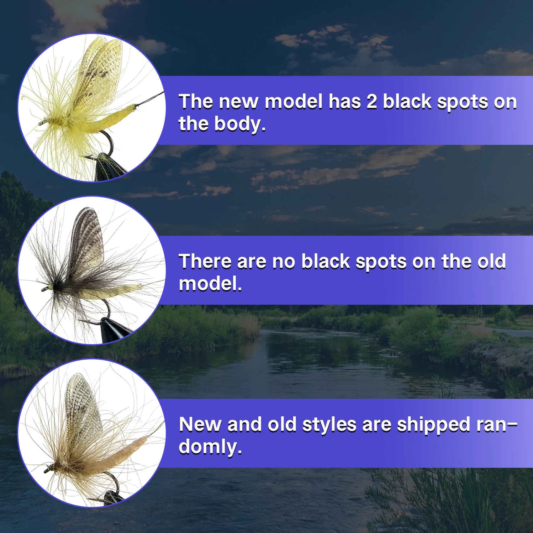Material: Wings are flexible, transparent, waterproof, and UV resistant. Bodies are soft and of micro hollow structure, keeping a fly on the surface. High tech UV integrated in the bodies gives full spectrum of fluorescence and fish attracting. All the body parts are environmental friendly.
